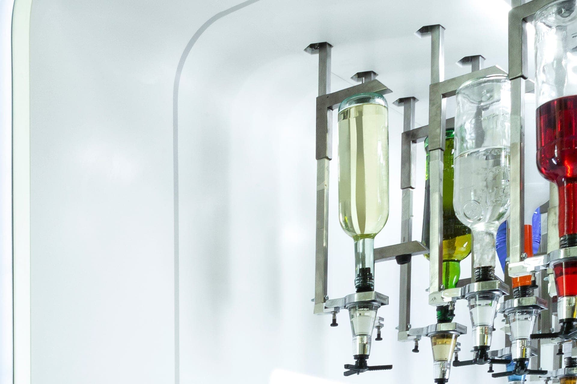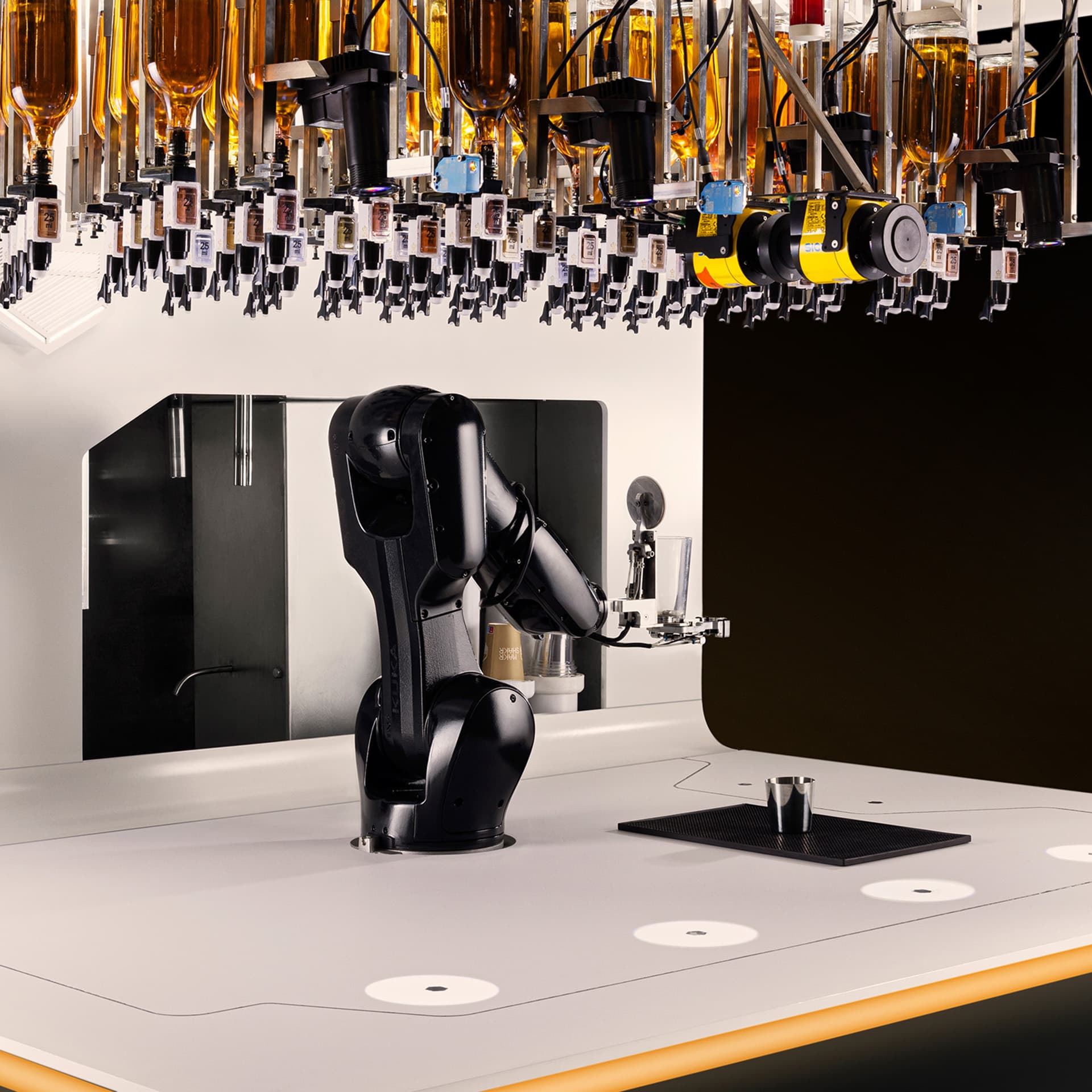 The robotic arms skillfully navigate 158 bottles of different spirits and juices hanging from the ceiling of the bar.